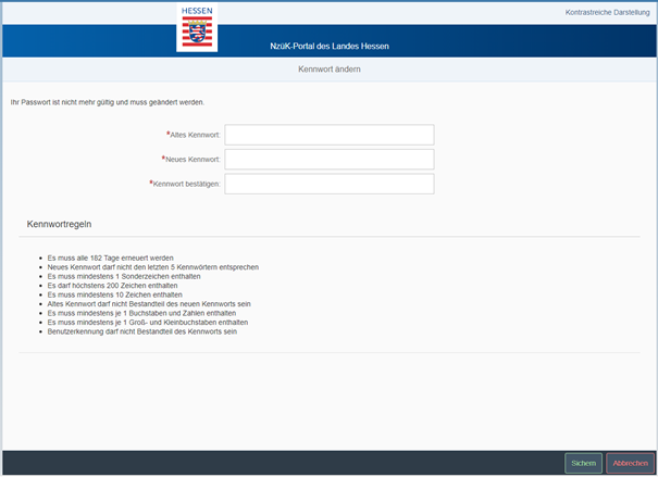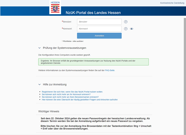 Seit dem 22. Oktober 2024 gelten die neuen Passwortregeln der Hessischen Landesverwaltung auch für das NzüK-Portal. Ab diesem Termin werden Sie bei der Anmeldung aufgefordert, ein neues Passwort zu vergeben.